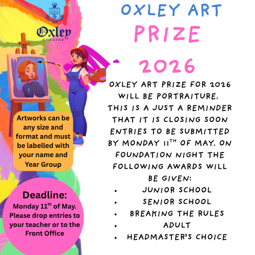 Entries are still open for the Oxley Art Prize. This year’s theme is portraiture. All students and families are encouraged to take part. Works will be exhibited on Foundation night and prizes awarded. Artworks can be any size and format and must be labelled with your name and year group. Entries can be given to class teachers or dropped in to the Junior School office.