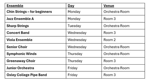 Ensemble Rehearsal Schedule and Music Tuition Information.