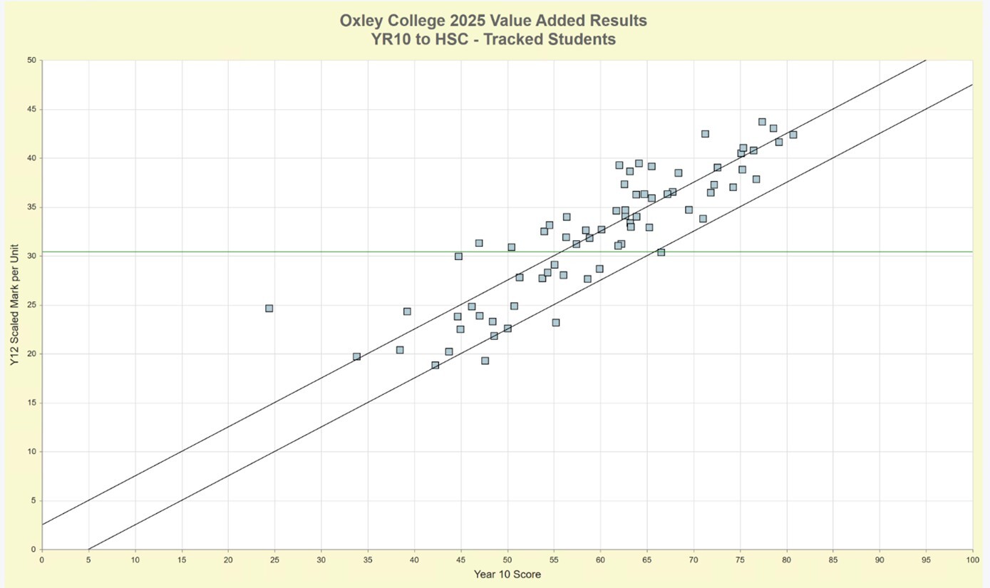 Last year I wrote about a range of initiative that we had put in place to try to increase our value-added score from approximately 70% over the past 5 years. Now whilst none of these changes would have had the impact that quickly, the change in culture and encouraging students to work proactively with each other and their teachers, rather than competing has a huge impact. This graph shows student overall Year 10 score on the horizontal axis against their average scaled mark per unit on the vertical axis. If a student lies between the two diagonal lines, they are progressing as expected with age. This graph shows that 96% of our students met or exceeded expectations.