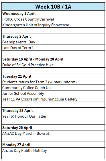 Dates: Term 1, Week 4 (Wednesday 18 February) to Term 1, Week 6 (Wednesday 4 March). Students who qualify for the IPSHA Cross Country Carnival will continue training until Wednesday 25 March (Week 9).