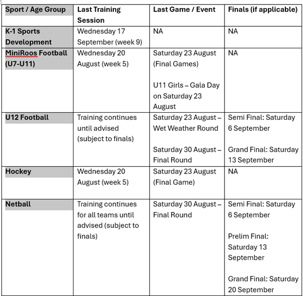 Please take the time to read the information below, which outlines the final training sessions and game details for all Winter Sports. Please note that some teams may progress to finals in the coming weeks, depending on results. Those teams should continue training until notified otherwise by the Sports Department.