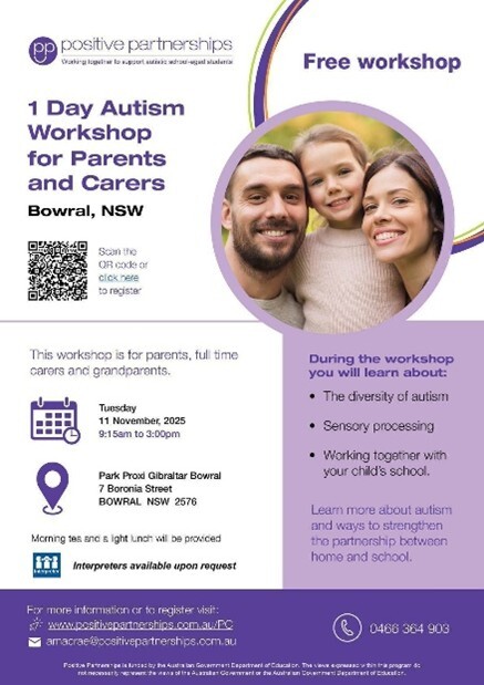 Positive Partnerships is running a one day autism workshop for families in Bowral on Tuesday 11 November. The families will have the opportunity to discuss their child, work through a planning tool and learn about the home school partnership. This is a Federal Government initiative and there is no cost involved.